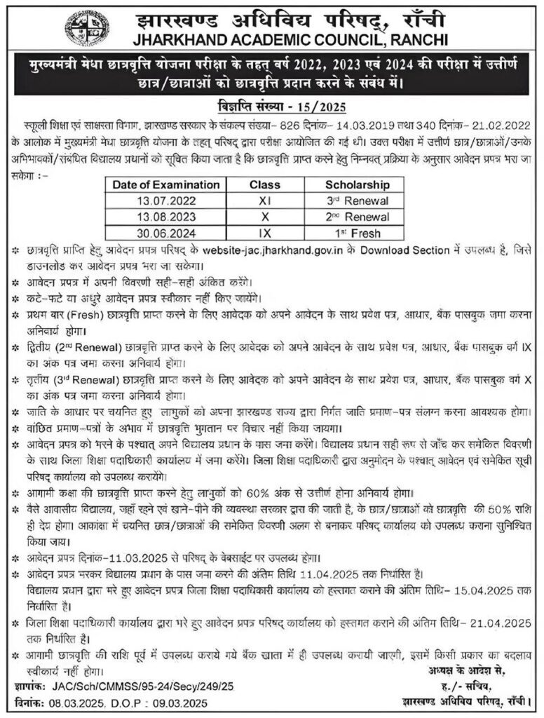 The online application of the students who want to apply under the Jharkhand Mukhyamantri Medha Scholarship Scheme Examination will start from 11 March 2025 from the official website of the council. The last date for filling the application form and submitting it to the school principal is 20 May 2025. Apart from this, the last date for handing over and approve the filled application form to the council office by the District Education Officer’s(D.E.O) office is 27 April 2025 to 22 May 2025.