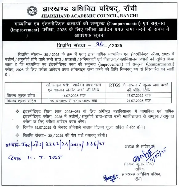 Jac Board Class 10th students who have failed and want to appear for the compartment exam and improvement exam, online application for the exam starts from 03 July 2025 and last is 14 July 2025 without fine and with late fine is 11 July 2025 to 17 July 2025.