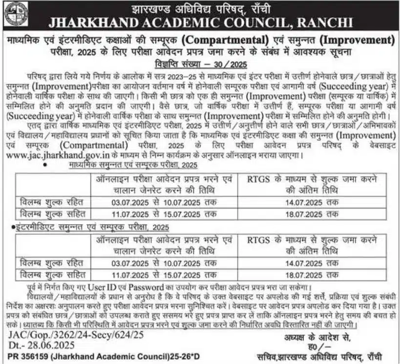 Those students of JAC Board who have failed in the exam they can give compartmnet exam or want to get more marks in their exam by giving improvement exam, if they are not satisfied with their marks, then the good thing for the students is that the notification for Compartmental and Improvement Examination 2025 has been issued by the JAC Board. Students will be able to apply online through school from 3 July 2025 and the examination schedule of the students will be released soon by the JAC Board.
