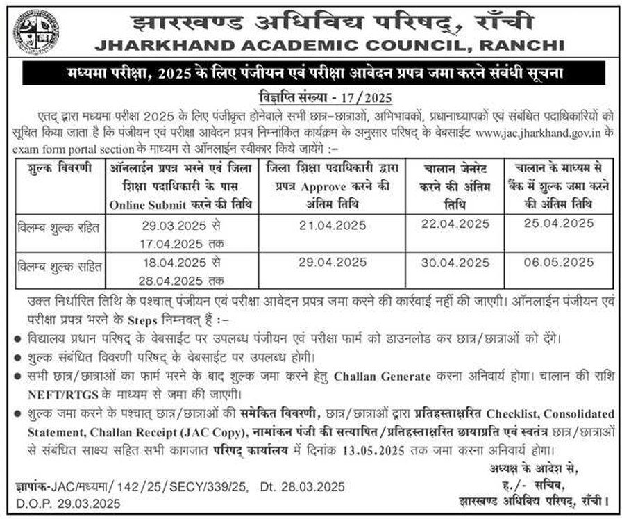 JAC Madhyama Registration Form 2025: Jharkhand Academic Council (JAC) has released the registration date for the Madhyama exam to be held in 2025. Candidates who want to appear in the Madhyama Sanskrit exam can register for the JAC Madhyama Exam 2025 from 29 March 2025. The last date for online registration without fine has been fixed by the JAC Board as 17 April 2025.